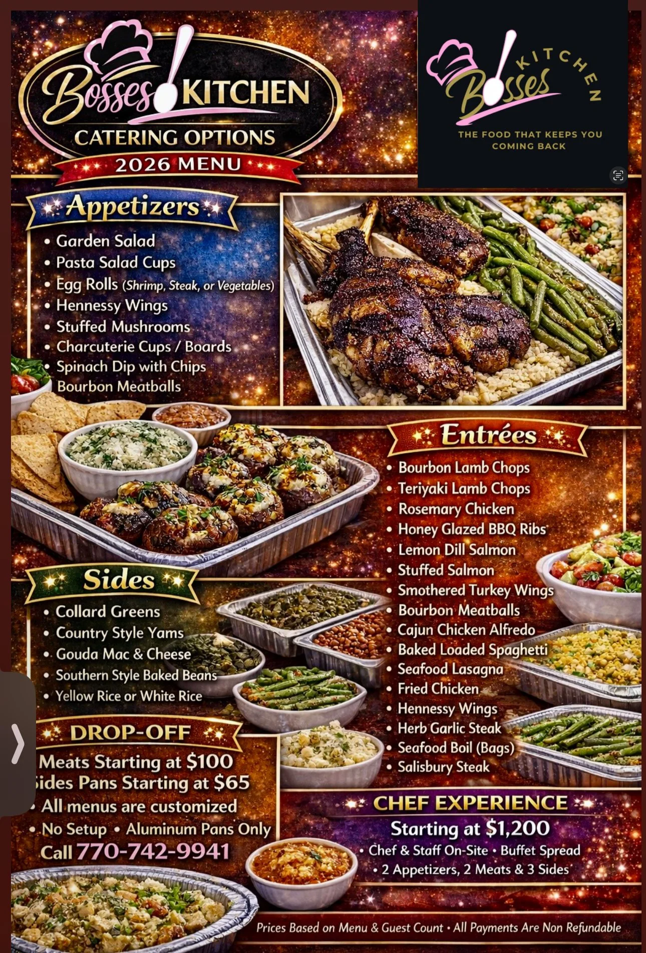 For more information, contact us at 770-742-9941 or email bosseskitchen@gmail.com.